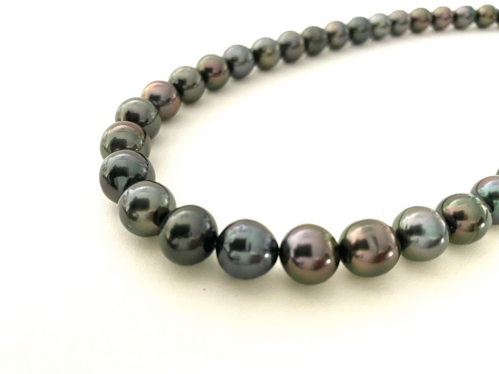 黒蝶真珠8.0-10.7mmパールネックレスです。形がきれいなラウンドではないオーバル系のネックレス になりますが、付けてしまうと気になるほどの変形ではありませんので、仏の席でも十分に使っていただけるネックレス です。金具(クラスップ)はワンタッチ式(シルバー製)